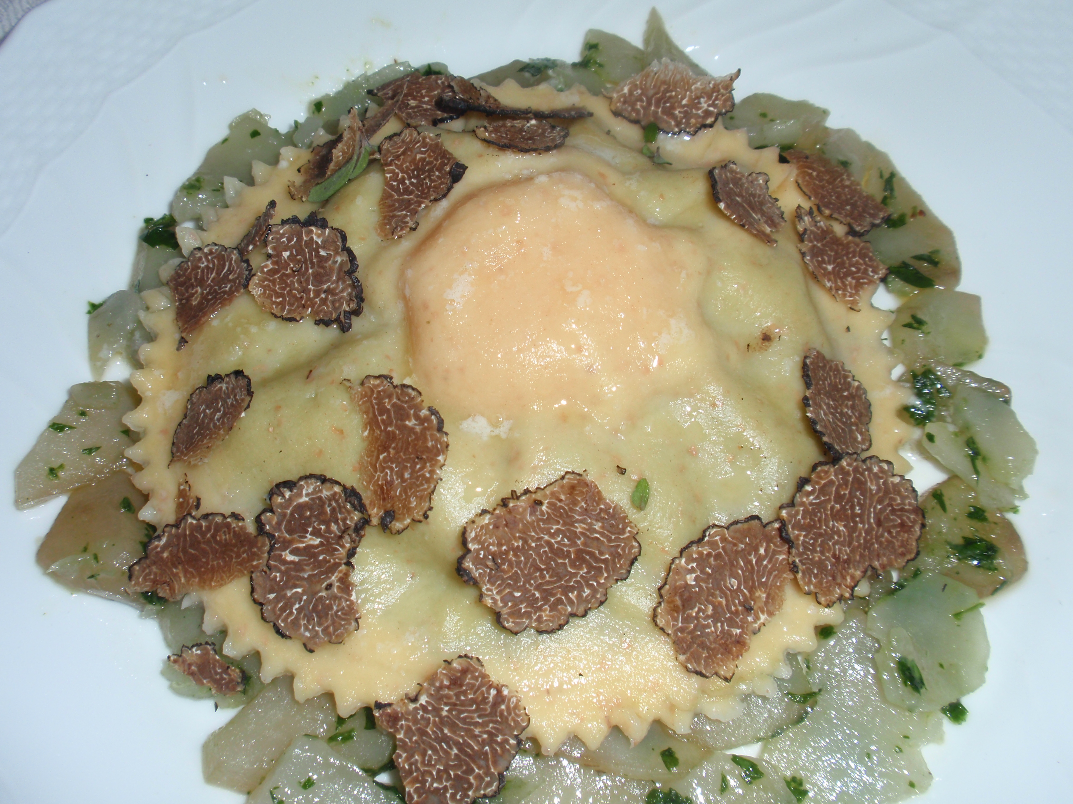 Tortellone di ricotta su letto di topinambur e tartufo nero di Valgrana